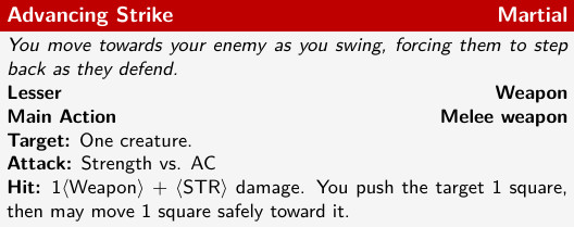 Firstly, moving enemies around: this is something Ragnvald might need to do repeatedly in order to push forward or keep enemies back. Let’s make sure it’s a lesser power, so that it costs no resources. Advancing Strike fits the bill: this lets Ragnvald push an enemy 1 square and then move safely towards it to close the gap. (I’ll talk about safe movement in detail in a later post; for the time being it is enough to understand that this lets Ragnvald move back towards the enemy he just pushed without being attacked himself.)