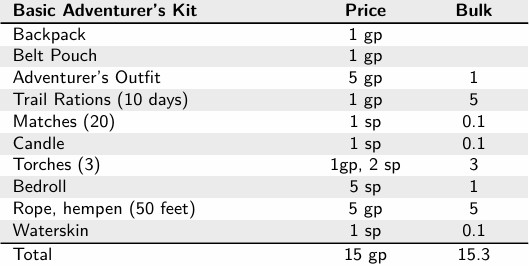 With 45gp unspent, Ragnvald can afford some extras. For starters, he’ll pick up a Basic Adventurer’s Kit (left) costing 15gp. This contains all the basics for an adventurer: a backpack and belt pouch for carrying things; durable clothing; food and a waterskin; light sources; a bedroll for camping; and the ever-useful coil of rope.