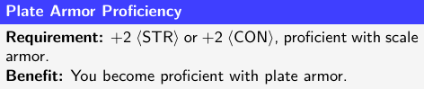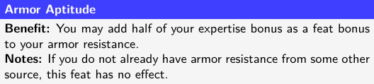 The three armor groups are good for different things: light armor can give a character higher AC (easily 17 before feat and item bonuses, less easily 18) at a relatively low cost in ability points, but offers little to no AR. Medium armor can give similarly high AC and better AR, but it either requires more investment of ability points, or reduces the character’s ability to move. Heavy armor doesn’t allow for quite as high AC unless a character is proficient with plate, the heaviest type of armor, and definitely reduces a character’s ability to move, but offers some of the best AR and requires no ability points at all.