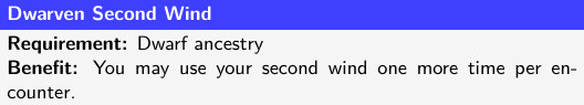 Since I need to pick just one, I’m going with Dwarven Second Wind for its added durability (and thematicness!), but the other options here will remain useful options as Ragnvald levels up and picks out more feats.