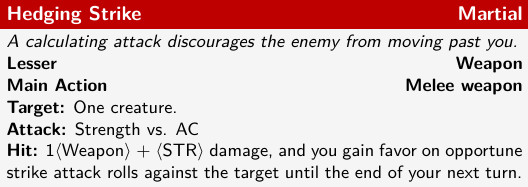 Next, keeping enemies from moving around him. While the Battlefield Superiority class feature goes some ways towards this, let’s lean into it and try to make Ragnvald even “stickier.” Hedging Strike (right) will synergize nicely. This will make Ragnvald’s opportune strikes even more accurate, beyond even the bonus he gets from the Battlefield Superiority class feature. If he hits an enemy with Hedging Strike, that enemy will face a very accurate opportune strike if it then moves.