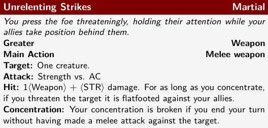 This is the first power I’ve shown that uses concentration: a character can concentrate on one effect at once, which might be a series of weapon attacks like this, or a magical spell. Concentration can be broken by taking a significant amount of damage, by conditions such as being stunned, or by power-specific requirements like in this case.