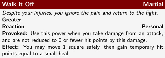 This is a reaction power, and as all reactions, is Provoked by a specific event. In this case, Ragnvald can use this power when he is damaged but not downed by an attack, and can then safely move a short distance and gain temporary hit points equal to a small heal (which is generally equal to one healing die, in Ragnvald’s case a d12). This can get Ragnvald out of a sticky position and also give him a few temporary hit points to make up for the damage he took.