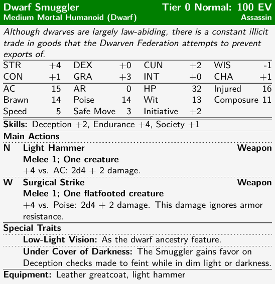 - “Tier 0 Normal: 100 EV” conveys information for the GM about how much of a challenge the Dwarf Smuggler poses. “Tier 0” indicates that this creature is balanced around being a typical challenge for characters at level 0; “Normal” means that this monster is intended to be an equivalent to one PC, as opposed to Elite or Champion monsters that have hit points making them equivalent to two or five PCs, and make attacks to match. (I’ll show off some monsters like this in later posts.) “100 EV” is a numeric value that the GM can use to design an encounter: EV is short for “Encounter Value,” and 100 EV is the value appropriate to one level-0 PC.