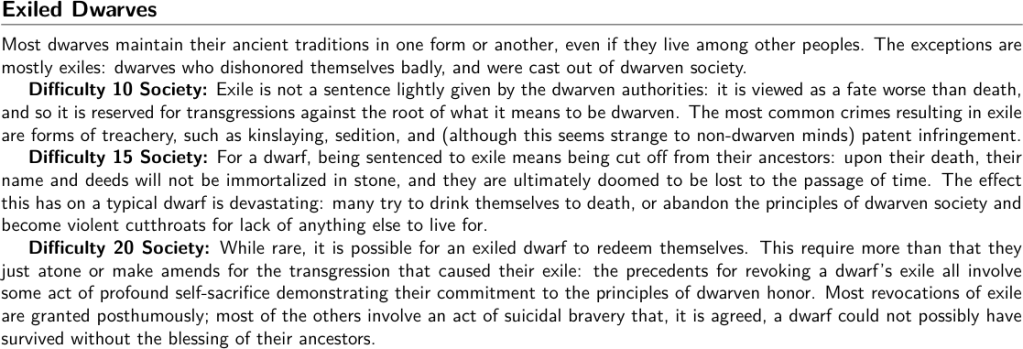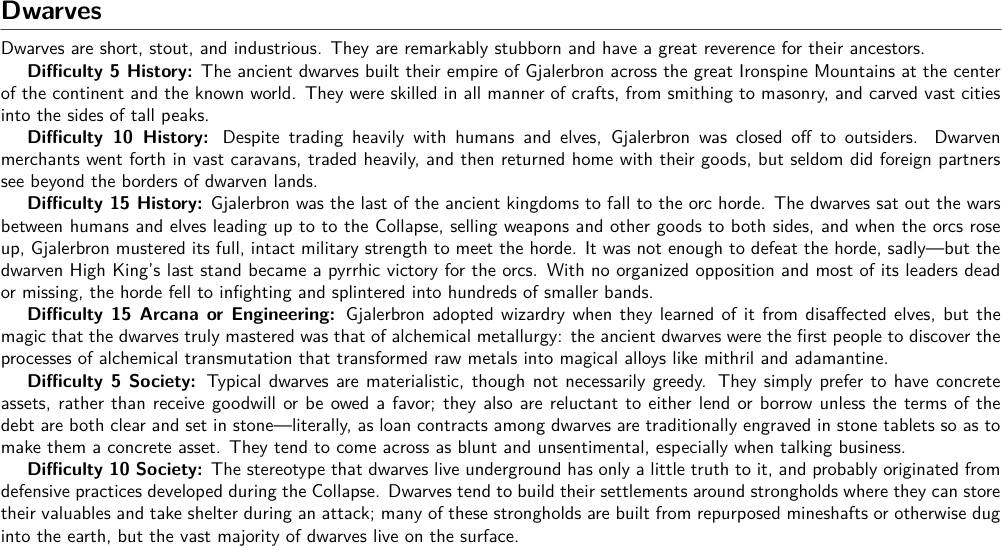The first paragraph here (which doesn’t have an associated Difficulty) is common knowledge that an Aetrimonde character could be counted on to know about dwarves. The rest of this information is locked behind various skill checks, with the most esoteric information needing the best check results.