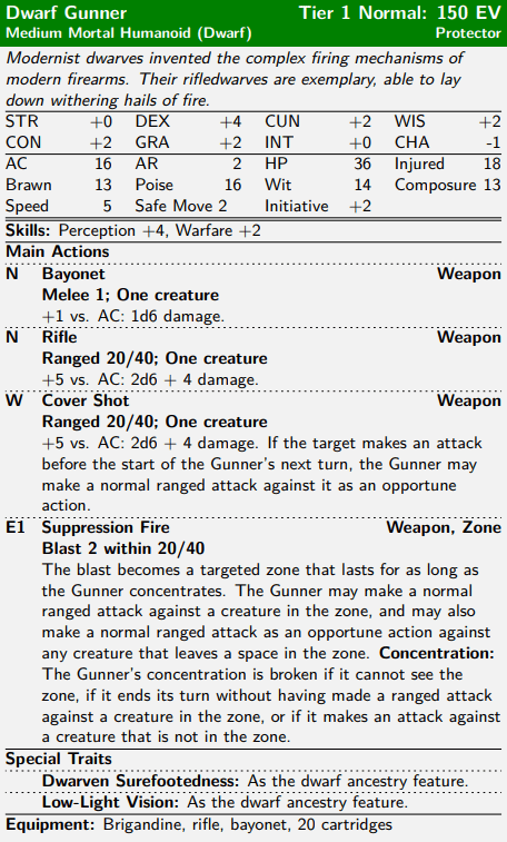 The Dwarf Gunner can present more of a puzzle in combat, especially if it is backing up the right kinds of other enemies (like an entire squad of ranged attackers) or has favorable terrain (like a position with cover overlooking a chokepoint). A well-placed Suppression Fire can give an entire party of PCs second thoughts about trying to move up to melee range, but there are several ways to deal with it: