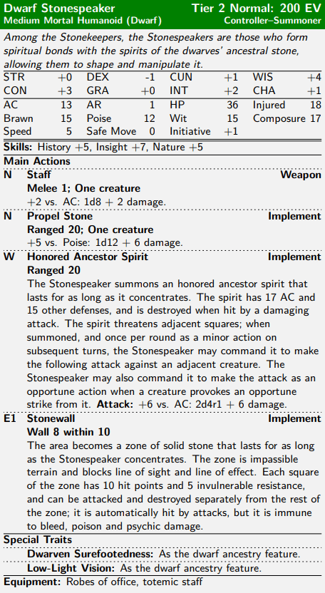 The Dwarf Stonespeaker is a Tier 2 enemy, which is about the most challenging foe Ragnvald should face at level 0. At 200 EV, two Stonespeakers would be nearly a match for a typical adventuring group, which would include Ragnvald and four allies. Two Dwarf Stonespeakers could be manageable, if a slightly difficult fight; three would be pushing it.