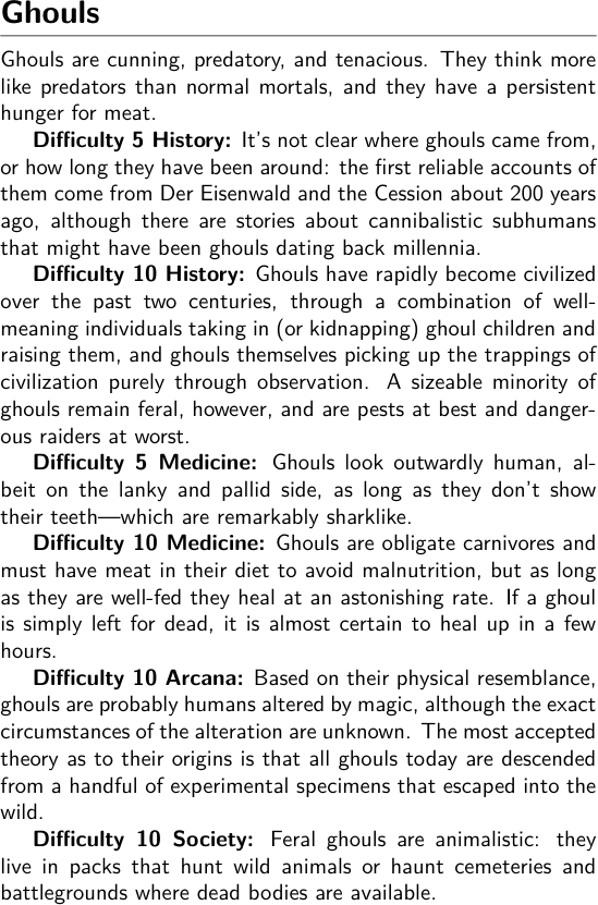 - Ghoulish Resilience is a twist on the Ghoulish Regeneration and Ghoulish Tenacity ancestry features, which would be problematic if given to a mook: the GM would have to track whether each mook had used Ghoulish Tenacity, and would also have to make survival rolls for each one to make use of Ghoulish Regeneration. Ghoulish Resilience captures the essence of these features, which is that a ghoul has a good chance of surviving a lethal blow and standing up again on their next turn, and does it without requiring the GM to track anything other than prone-ness.