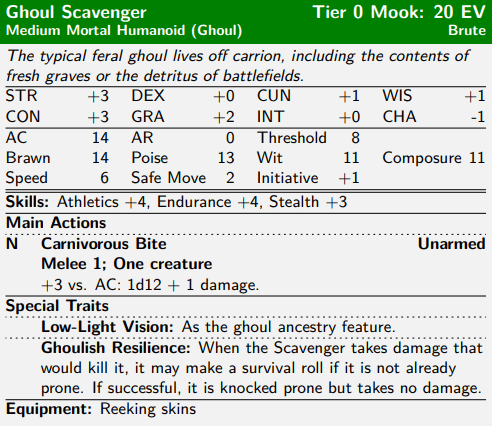 The Ghoul Scavenger indeed has mediocre defenses. And while mooks don’t have hit points, it has a relatively high Threshold of 8, meaning that a typical damage source (1d8 + 4) will fail to kill it more than a third of the time: this gives it the toughness of a Brute.