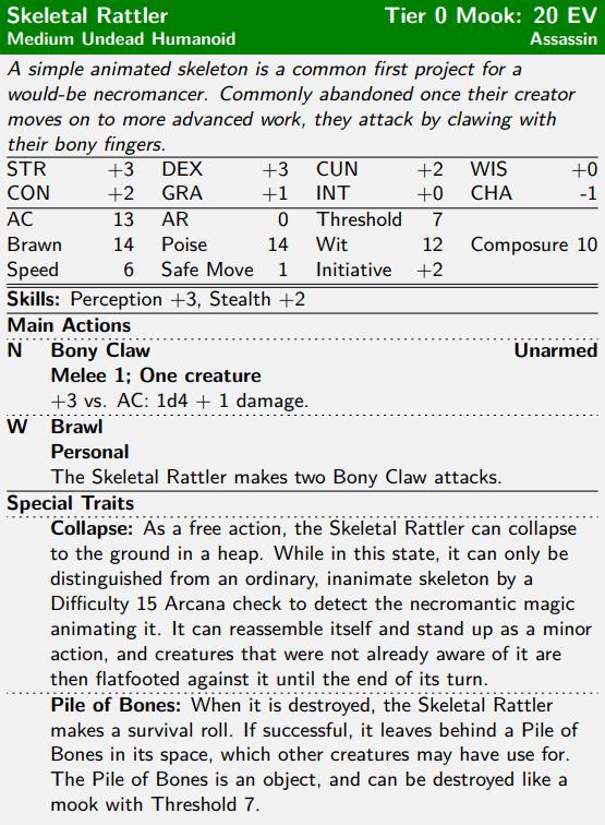 The Skeletal Rattler is the simplest, weakest skeletal enemy in the Bestiary. Not nearly as durable or as strong as a zombie, it is a subtler enemy with a couple of tricks to pull. The first is that it can ambush the PCs by pretending to be an inanimate skeleton, or blending into a heap of bones (like might be found in a crypt or abattoir). This is what makes it an Assassin.