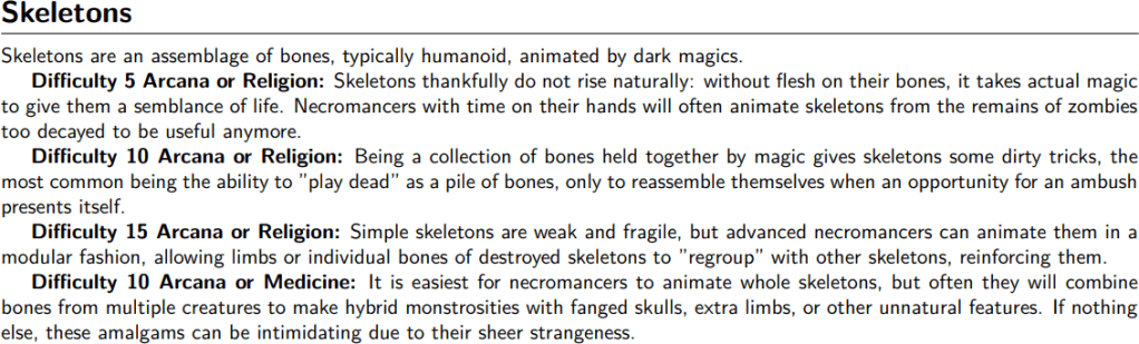 By themselves, Skeletal Rattlers don’t pose much of a threat. But in an encounter with other, more powerful skeletal enemies, PCs will need to be careful about killing them off: wiping out a horde of Skeletal Rattlers will leave a lot of resources lying around for the other skeletons to use. The PCs can of course just let this happen, but they could also try to dispose of the Rattlers by, say, tossing them off of cliffs, or throwing them into industrial machinery that would destroy the Piles of Bones they leave behind. Or, they could devote some attacks to destroying the Piles of Bones as they create them.