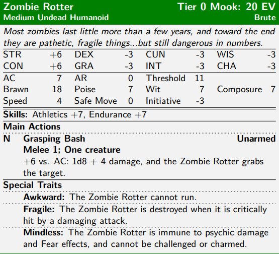 The only reason that the Zombie Rotter doesn’t have a higher Tier is that it has downsides to go with these strengths: it’s slow, it can’t run, and it’s destroyed by any damaging critical hit (even if the damage from that wouldn’t break its Threshold, which is entirely possible with weaker attacks at low levels).