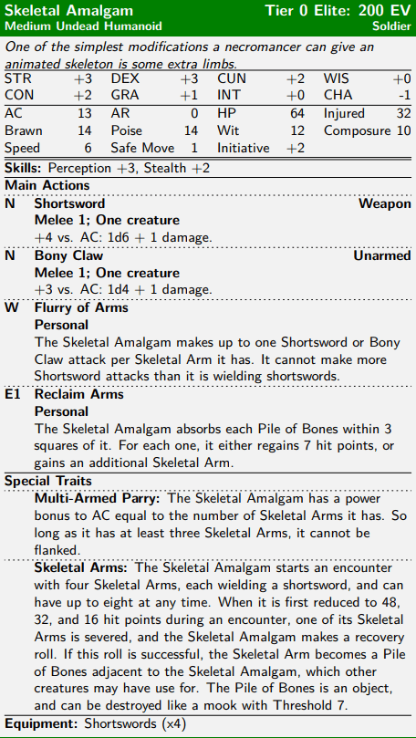 The Skeletal Amalgam is classed as a soldier, but if you’re just looking at its defenses in the statblock, it might not be clear why. With a mere 13 AC, it certainly doesn’t look much like a Soldier. But the Multi-Armed Parry special trait makes up for this: with +1 AC per Skeletal Arm, its actual AC will start out at 17, and can get as high as 21 if a Skeletal Amalgam manages to acquire its maximum of eight arms. And, as long as it keeps at least three arms, it cannot be flanked (due to having an arm in every direction to parry with).