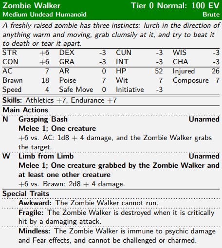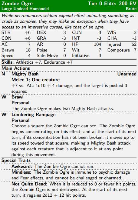 This is also a great point for me to introduce one style of action that I’m building into many of the creatures in the Bestiary, which is the “interruptible” action. That’s not a defined term in the rules, but the concept of it is that actions like Lumbering Rampage are powerful, but their actual effect is delayed, and there are ways for PCs to either stop the enemy from following through (such as by breaking the Zombie Ogre’s concentration, in this case, which would take something dealing 26 damage to it, or somehow stunning it) or just get out of the way. Some interruptible actions can also be turned against the user or their allies: in this case, the PCs could shove their enemies into the path of the Lumbering Charge and let the Zombie Ogre trample them.