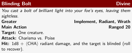 Blinding Bolt is a nasty control power by itself, because it inflicts one of the nastiest of Aetrimonde’s standard conditions. (Blinded: a creature that is blinded is flatfooted, cannot see, cannot take opportune actions or reactions, and becomes helpless if it is also deafened. All creatures have total concealment from a blinded creature.) It also synergizes incredibly well with Conviction: blinding an enemy drastically handicaps it, and if it is Anathema or Denounced, Ipki can expect to keep it blinded for several turns with a single greater power use.
