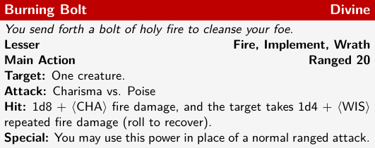 Burning Bolt is likely to be Ipki’s mainstay attack: it’s usable as a normal attack, deals solid base damage, and is one of a very few lesser powers that cause a recoverable effect. It makes for an excellent opener against an Anathema, or a creature Ipki has denounced, since her Conviction feature makes it incredibly hard for these creatures to shake off the repeated damage. Ipki can then follow up with other powers while the Anathema burns, reapplying Burning Bolt as necessary.