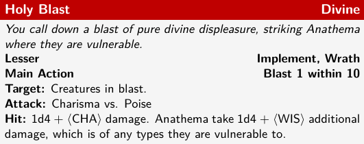 Divine Wrath powers have a lot of similarities to Arcane powers: they involve calling down the wrath of the gods, in the form of destructive energies. Wrath powers invoke searing fire, deafening thunder, blinding light, and bolts of retributive lightning. Most Wrath powers are long-ranged, which suits Inquisitors like Ipki just fine: they’re fragile enough that they don’t want to be anywhere near close combat.