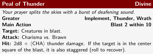 Peal of Thunder is a powerful area attack with the added benefit of staggering creatures in the center of the blast: like Blinding Bolt, this synergizes with Inquisitor class features, although staggering an enemy (Staggered: a creature that is staggered is flatfooted and cannot take actions when it is not its turn) is not nearly as potent an effect as blinding them. This is useful to help allies attack a single high-value target, while also helping to clear out the chaff from around them.